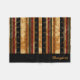Warm colours and a sophisticated pattern are incorporated into this design. Stripes of black, red, deep green, and a golden colour are set off by images of a leaf silhouette. Customize with the text of your choice.