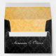 This envelope features sumptuous gold and cream damask on the inside lining. The outside is a luxurious, textured black design. The design is lightly distressed for a charmingly vintage look throughout. A couple's name is written in white script below the back flap.