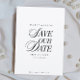 This classy elegant save the date card in black and white features a minimalist design with "save our date" styled in a mixture of classic text and elegant calligraphy script that lends a sophisticated, classy style with old money vibes. The design also features a place to add your photo that covers the entire back of the card.
