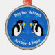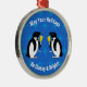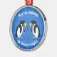 Keeping things classy for the holiday season are these adorable penguins, dressed in their tuxedos, and toasting the holidays. The ornament background design is dark blue with a light blue repeating snowflake pattern. The white text reads "May Your Holidays Be Classy & Bright!". You can remove the text or personalize the ornament with your own text.