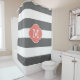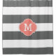 Elegant and Trendy Dark Grey and White Stripes Shower Curtains with personalized Monogram on coral pink quatrefoil. Chic patterns.