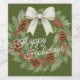 This beautifully designed holiday wine bottle label showcases elegant watercolor artwork of a wreath embellished with a white bow, pinecones, green holly leaves, red berries, and pine needles. Its classy yet rustic design captures the essence of the December holiday season and appeals to those who appreciate artistic illustrations. The label offers customization options, allowing you to personalize it with your seasonal greeting, making it a thoughtful choice for spreading holiday cheer.