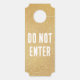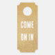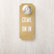 Golden print door hanger. One side says “Do not enter” and the other says “Come on in”. Customizable words if needed.