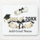 Class of for any year design featuring black ribbon and flower accents for the Classy Graduate. Design has gold and black text and white flowers with Mortar and diploma. Customize Name and year area.