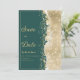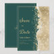 Classy luxury gold sparkle glitter wedding Save the Date invitation. Set against a deep green background,
