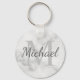 features personalized name in grey script font style and monogram in light grey serif font style as background, on white marble background.