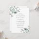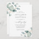 Rustic botanical boho chic beautiful emerald sage green dusty blue gold watercolor eucalyptus branches wedding invitation with elegant classic script.