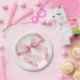 Featuring a soft, pink bow design on blush pink background, these table decor plates bring a delicate, feminine charm to your baby girl baby shower. The watercolor style adds a modern yet timeless look that pairs beautifully with pastel, neutral, or romantic party themes.
