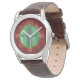 A classy round faced watch for men with a leather band. A unique red and green design with gold coloured numerals is the focal point. Great special occasions gift for your partner.
