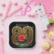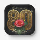 Celebrate an 80th birthday with this elegant customizable paper plate. The design features a magnificent gilded "80" with intricate baroque-style filigree, complemented by a vibrant red rose at its centre. Golden sparkles dust the black background, adding a touch of festive luxury. Customize it with the name and date to create a memorable detail for a milestone celebration.