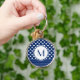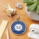 classy royal blue button keychain with your monogram and white hearts in polka dot pattern