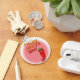A cute red chili pepper character. Custom key chains. Pink background.