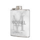 This flask features personalized groomsman's name with title and wedding date in grey and monogram in light grey as background, in classic serif font style, on white marble background.