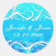 Classy Winter Blue Flourishes Save the Date Seal. A fancy and elegant winter save the date seal in a cool turquoise colour bokeh background and fancy white flourishes on the edges. A festive and unique theme holiday mailer label or correspond this with our winter wedding invitation set!. See store for complete wedding line in this style, invitations, rsvps, envelopes seals and more!