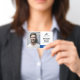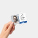 Employee ID badge with a clean minimalist design in blue, black, and white. Add a photo of the employee along with name and profession. Personalize further with your business logo.