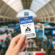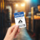 Vertical visitor badge with a simple design in blue and white. VISITOR is written in bold white letters against a blue background to be easily visible. Add your business name, logo, and branch.