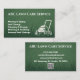 A professional yet friendly lawn care business card featuring a smiling mower icon, clean green background, and clear service listings — perfect for showcasing reliable yard care services.