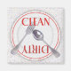 This dishwasher magnet has an illustration of a white dinner plate with a red stripe and textured red edge, and photos of a fork and spoon on the plate. The plate sits on a textured grey background looking like granite. It says CLEAN in red type on one side of the plate, with the word DIRTY, in "dirty" red letters, on the other side.