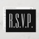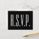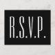 This clean, respectable R.S.V.P postcard design features the message "R.S.V.P." on the front. It also features a customizable RSVP form on the back, along with a customizable address that the completed RSVP cards would be mailed to. RSVP cards like this could perhaps be used to find out who will be attending a retirement party, a wedding shower, a wedding anniversary party, or some other celebration.