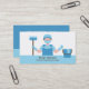 This business card comes with an illustration of a cleaner that is wearing mask, gloves, cap and overalls and holding on to a cleaning brush tool and showing thumbs up with the other hand. A pail bucket and cleaning cloth is nearby. Colour palette of blue and white communicates a sense of freshness and cleanliness. Perfect for those in the house cleaning services! Personalize easily with your business details in the text templates provided.
