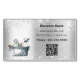 An elegant and glamourous business card on a faux silver looking background decorated with faux glitter dust on front and cleaning equipment. Personalize and add Your name, text, contact info and your own url to your website or your social media account to the QR code.