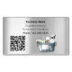 An elegant and glamourous business card on a faux silver looking background decorated with cleaning equipment. Personalize and add Your name, text, contact info and your own url to your website or your social media account to the QR code.