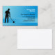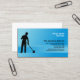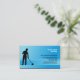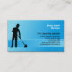 In this Cleaning Services business card, the silhouette of a man mopping the floor with a mop forms the main image over a striped gradient blue background. Customize this card immediately with your name and details.
