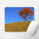 A peaceful 3D landscape in fall, created in Vue. On top of a hill covered with tall golden grass, against a clear blue sky, a solitary orange maple stands with a wooden bench under it to stop and rest on.