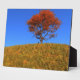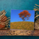 A peaceful 3D landscape in fall, created in Vue. On top of a hill covered with tall golden grass, against a clear blue sky, a solitary orange maple stands with a wooden bench under it to stop and rest on.