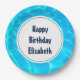 Birthday paper plates with a photograph of clear blue pool water, with shimmering reflections. Perfect for a pool themed birthday party.
