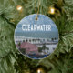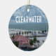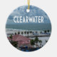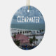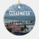 Clearwater, Florida, beach scene photo with beautiful clouds over the ocean, palm trees, and the name Clearwater at the top in white. Celebrate this beautiful vacation spot near Tampa Bay with a keepsake ornament.