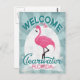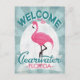 Clearwater Florida pink flamingo. In vintage travel posters style, it says "Welcome To Clearwater, Florida" in pink, white and mint green turquoise.