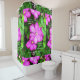 Vibrant magenta clematis flowers bloom against a backdrop of green leaves, interspersed with a religious quote from Romans 5:3-5 in elaborate script. The bright petals of the flowers draw the eye, while the contrasting greenery highlights the intricate details of the blossoms and the carefully placed text. This was a beautiful flowering clematis vine at a friend's house in June of 2013. The scripture is from a 1913 Nelson KJV Bible that once belonged to my great, great uncle John.
