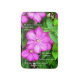 Vibrant magenta clematis flowers bloom against a backdrop of green leaves, interspersed with a religious quote from Romans 5:3-5 in elaborate script. The bright petals of the flowers draw the eye, while the contrasting greenery highlights the intricate details of the blossoms and the carefully placed text. This was a beautiful flowering clematis vine at a friend's house in June of 2013. The scripture is from a 1913 Nelson KJV Bible that once belonged to my great, great uncle John.