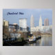 Cleveland, Ohio skyline view from the Cuyahoga River, with many of Cleveland's long time companies featured in this poster- Sherwin Williams, Terminal Tower and Tower City, Huntington Bank, Society ( Key) Bank, Federal Builiding and of coursr the historic Cuyahoga River, complete with tugboat moored ready to go to work ! Add a frame to this poster for a wonderful additon to home or office !