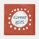 A bold red background features the phrase "clever girl" at the centre, enclosed by a ring of white dots surrounding a larger white oval. The playful and simplistic design emphasizes the central message.