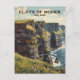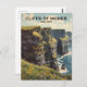 A scenic postcard showcasing the dramatic Cliffs of Moher in Ireland, with sheer rock faces rising above the Atlantic Ocean under a soft, cloudy sky.