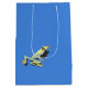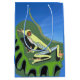 This colourful gift bag features my simple design of a green tree frog on a jungle leaf against bright blue sky. Ideal to fill with gifts and treats. Lovely for all ages and perfect for frog lovers.