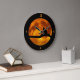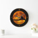 A beautiful and simple clock design with a large, orange, darker brown and yellow full moon at its centre and black background. The black silhouette of a thick tree branch crosses the moon, horizontally, at its lower part. On this branch a cat, also as a silhouette, sits, seemingly staring at the moon. The hour numbers are also in orange colour. An orange thin line runs along the edge of the clock.