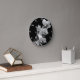 This black and white round clock has pretty Phalaenopsis Orchids that were enhanced, and changed to black and white. The hand is a light grey, and the numbers are white.