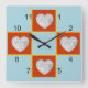 Heart shaped frames on blue background. Family pictures, or ? Show in the 12, 3, 6, and 9 spots on this "patch work quilt" clock. Your square images will be placed within the red heart shaped frame. Background may be Customized/edited to colour of your choice. (Defaults to light blue)