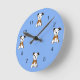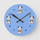 Doc drawing. Caricature of toy dog with brown body and ears, white face feed and tummy. Image sits at 12, 3, 6, and 9 positions. Background in medium blue.