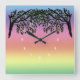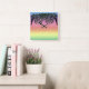 Tree, in black with tint of green, reaching from upper corners over the white numerals of the clock face. Background is striped rainbow colors shading through blue purple, pink, red, orange, yellow, and green, from top to bottom.