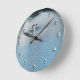 Photograph of two Western Grebes (shore birds) swimming close together in the calm waters of a harbour . The white necks and black heads are very distinctive as the birds sit within the numerals on the clock face. Numerals are in white with a drop shadow.
