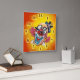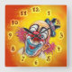 On this clock design, a portrait of a bright coloured, laughing clown with a hat on the bold part of his head and pink hair on the either side of his head. The background is bright yellow and orange, with sparkling stars.