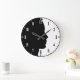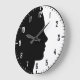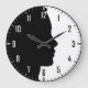 A modern and appealing clock design featuring the black silhouette of a beautiful woman's face in profile, on a white background. The hour numbers are all displayed, black on the background and white in the black silhouette. The same applies to the hours and minutes dashes along the edge. Also along the edge, there is a thin black circle, visible only on the white background.
