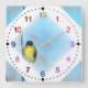 Yellow bird grasps a vertical branch. White face of the clock has a diamond vignette in the centre, allowing the image of the bird to appear as if perched on the white frame. Numerals are rainbow colours (12 being yellow like the bird). Minutes are marked with small numerals around outer edge.