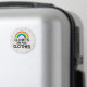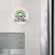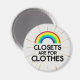 Gay pride themed magnet features large rainbow with "closets are for clothes" in bold black text on light gray background with gold starburst