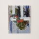 Une clôture blanche avec neige avec un closeup de Bow qui est lumineux et coloré avec un arbre vert. Au nord de Hutchinson Kansas dans le pays. C'est sur un PUZZLE.