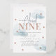This cute "the bride is on cloud nine/9" bridal shower invitation features fluffy blue clouds and faux gold stars on a white background. The reverse side features a white background with geometric patterns in light blue. Personalize for your needs. You can find more matching products at my store.